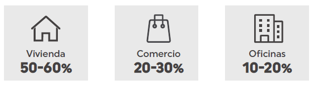 - Distribución actual del uso del suelo urbano: 53% vivienda, 20% comercio, 27% oficinas